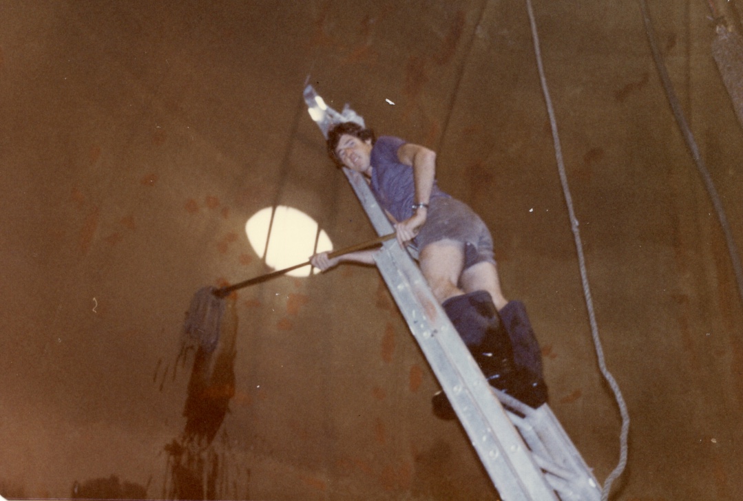 Gary Kelly says "it was hot as Hades in there. We used to drag a 25ft extension ladder up the side of the ball and then drop it inside. After the water had been drained out, we cleaned the inside down with a mop and straw broom to get the dirt and sludge off before we painted the rust spots. We used to drag a hose up and when the gravelly sandy grit was cleaned off and sitting in the bottom of the ball, we'd hose it out the outlet. One day it blocked up and while we were trying to unblock it all this pressure built up and when it finally cleared it shot out into the middle of the road and we just missed this mum walking along with her kid in a pram!