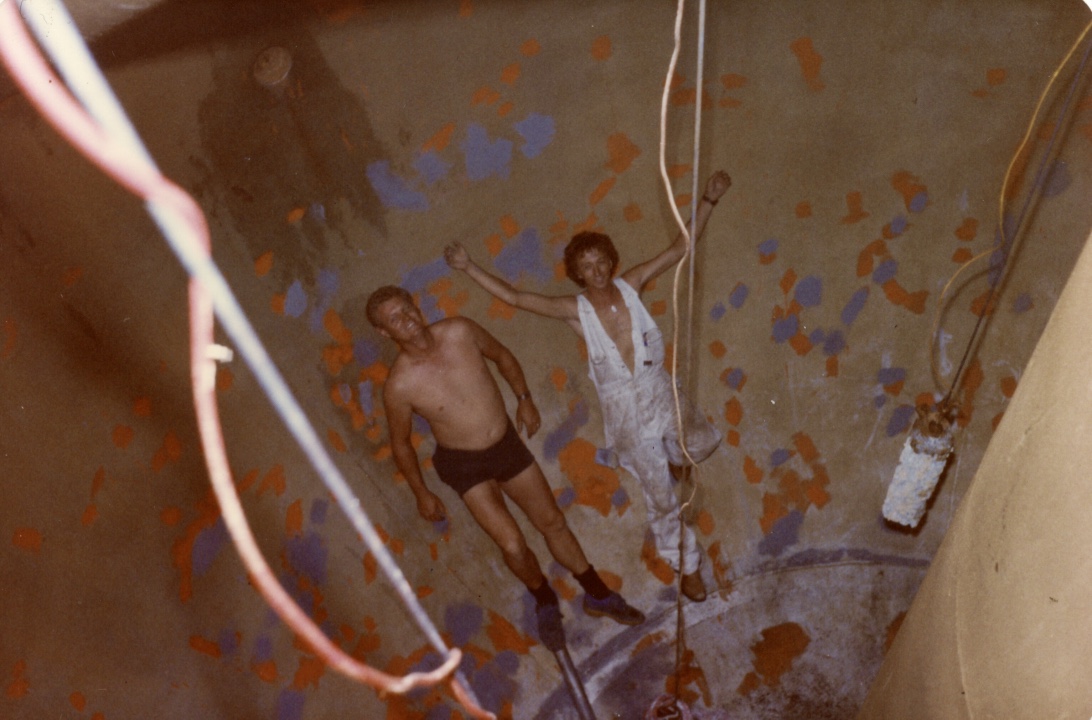 These amazing photos are of Gary Kelly, Keith Clark and Kevin (Shagger) Fry working inside the Silver Ball in 1984. Here you can clearly see the internal tank and the anodes that hung in the ball at different heights. These carried a minimal electric charge and were designed so that rust would attack them rather than the steel ball.