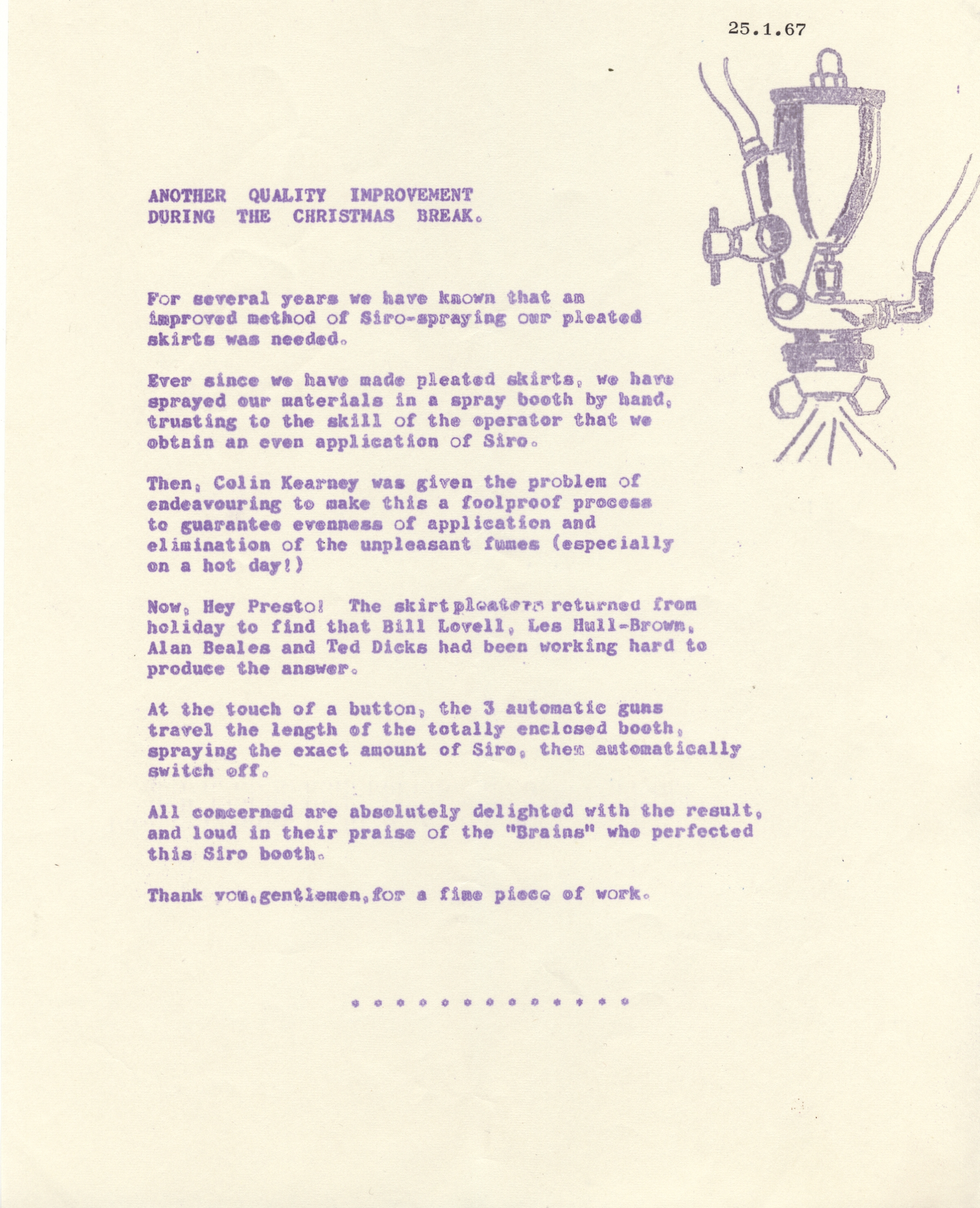 "For several years we have known that an improved method of Siro Spraying our pleated skirts was needed.