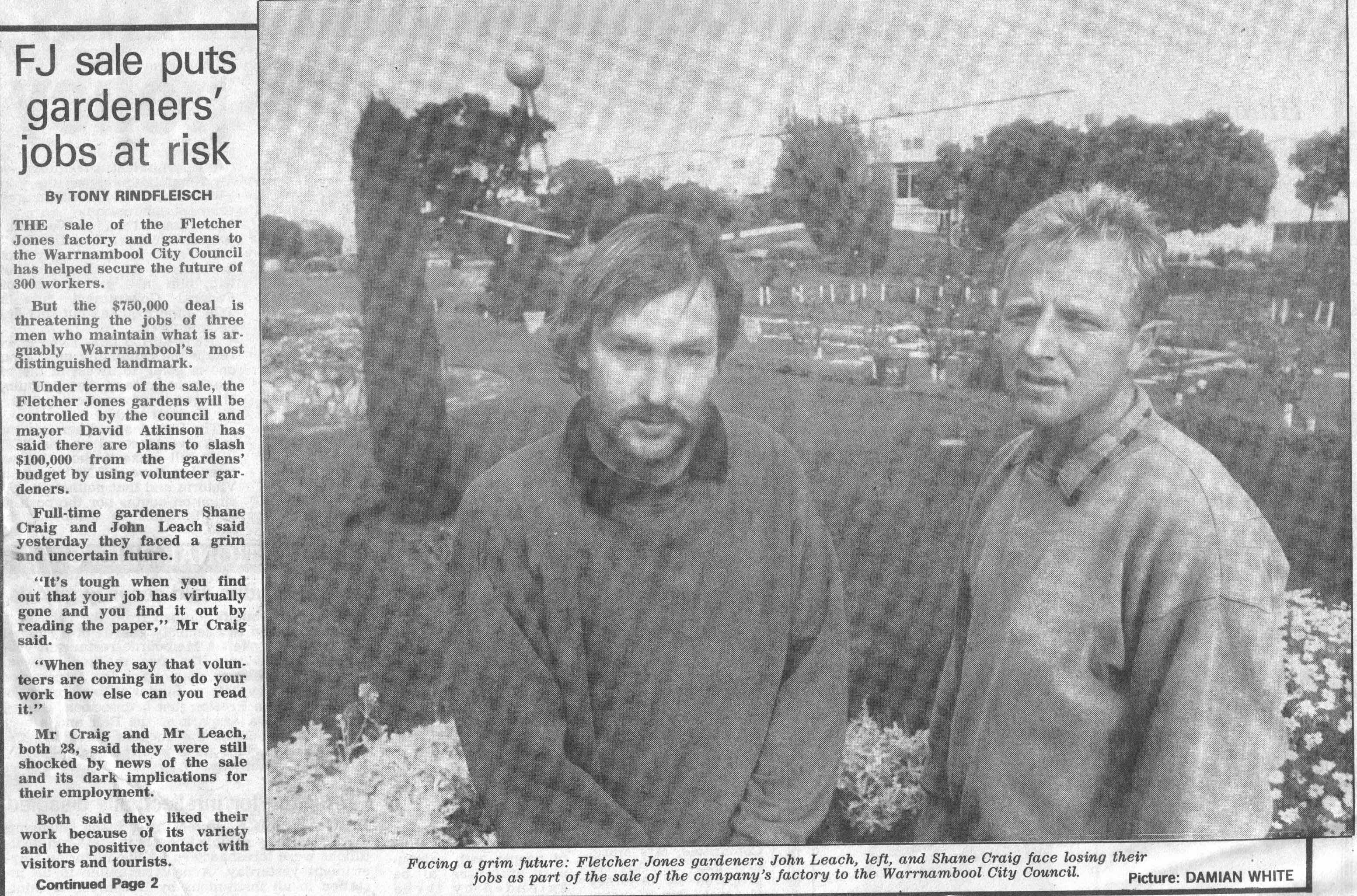 John Leach and Shane Craig face losing their jobs with council proposal to use volunteer gardeners. Warrnambool Standard April 30, 1992. Shared by Lawson Ryan