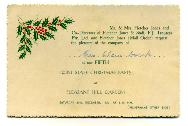 Each year, Fletcher Jones held a staff Christmas party and lots of people have wonderful memories of these parties and the Christmas presents they received. Since 2014, alongside the restoration of the Fletcher Jones Pleasant Hill site, community picnics have been held in the gardens annually in December to echo and celebrate this aspect of Fletcher Jones history.