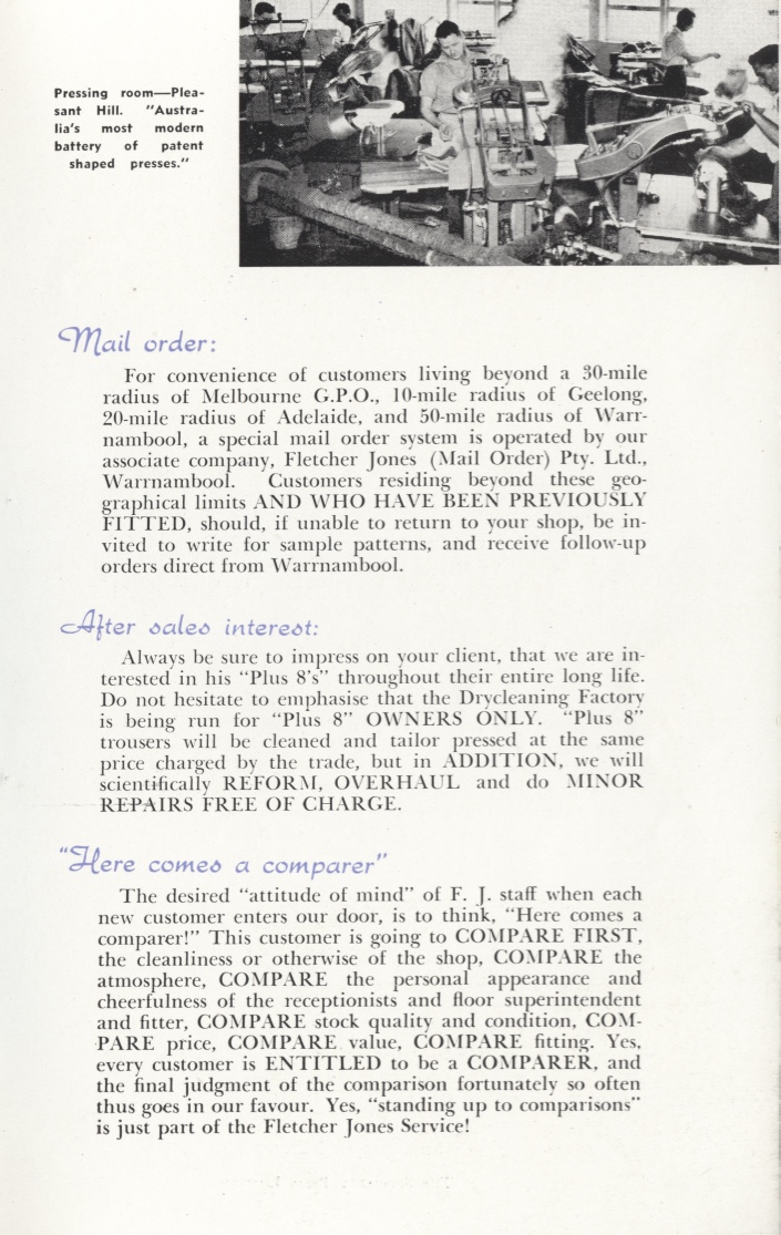 "In the late 1940s FJs was receiving complaints that their garments were shrinking with some dry cleaners and so we decided to set up our own dry-cleaning factory in Warrnambool where we carried out dry cleaning, repairs and alterations on customers garments. At first garments were sent to Warrnambool to be dry cleaned from all stores around Australia. The freight proved quite expensive as they were sent by air to Melbourne and then on our truck to Warrnambool, which would run daily. We then decided to open our own dry cleaning factories in Brunswick, Sydney, Hobart, Adelaide and Brisbane as well as Warrnambool. These factories also carried out new garment alterations for the retail stores.