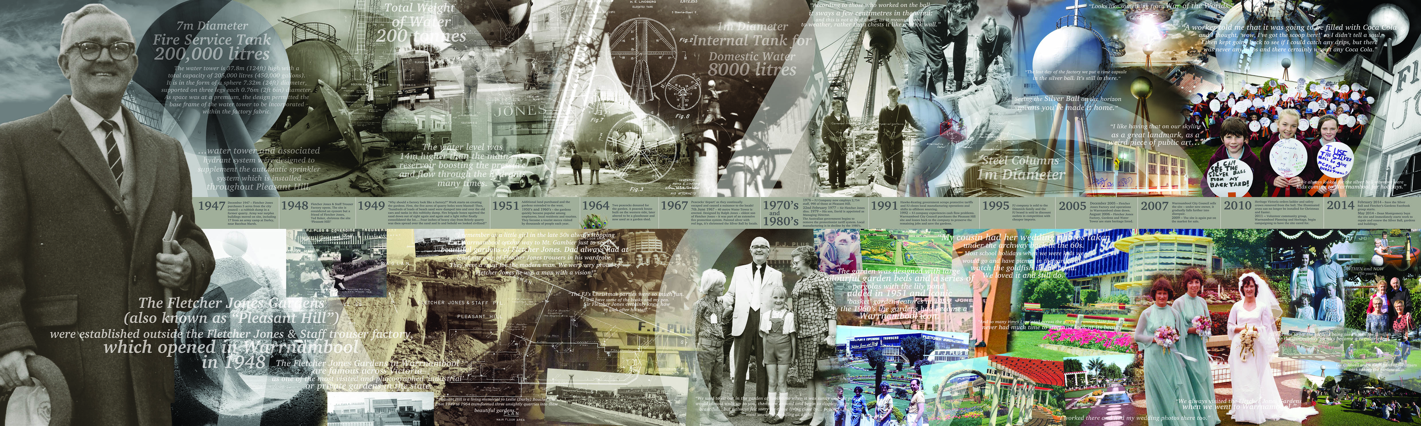 This 5m x 1.5m panel is located on the Fletcher Jones (Pleasant Hill) site.  It was created in 2015 as part of the Fletcher Jones Stories Project. The panel features images of the installation and history of the Silver Ball and the unique development of the FJ gardens as a haven for staff, tourists and locals.  Designed by Mark Rashleigh using photos, anecdotes and information shared during the first part of the FJ Stories Project.  Souvenir cards of the panel are available at the entrance to the Fletcher Jones second hand markets.