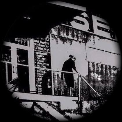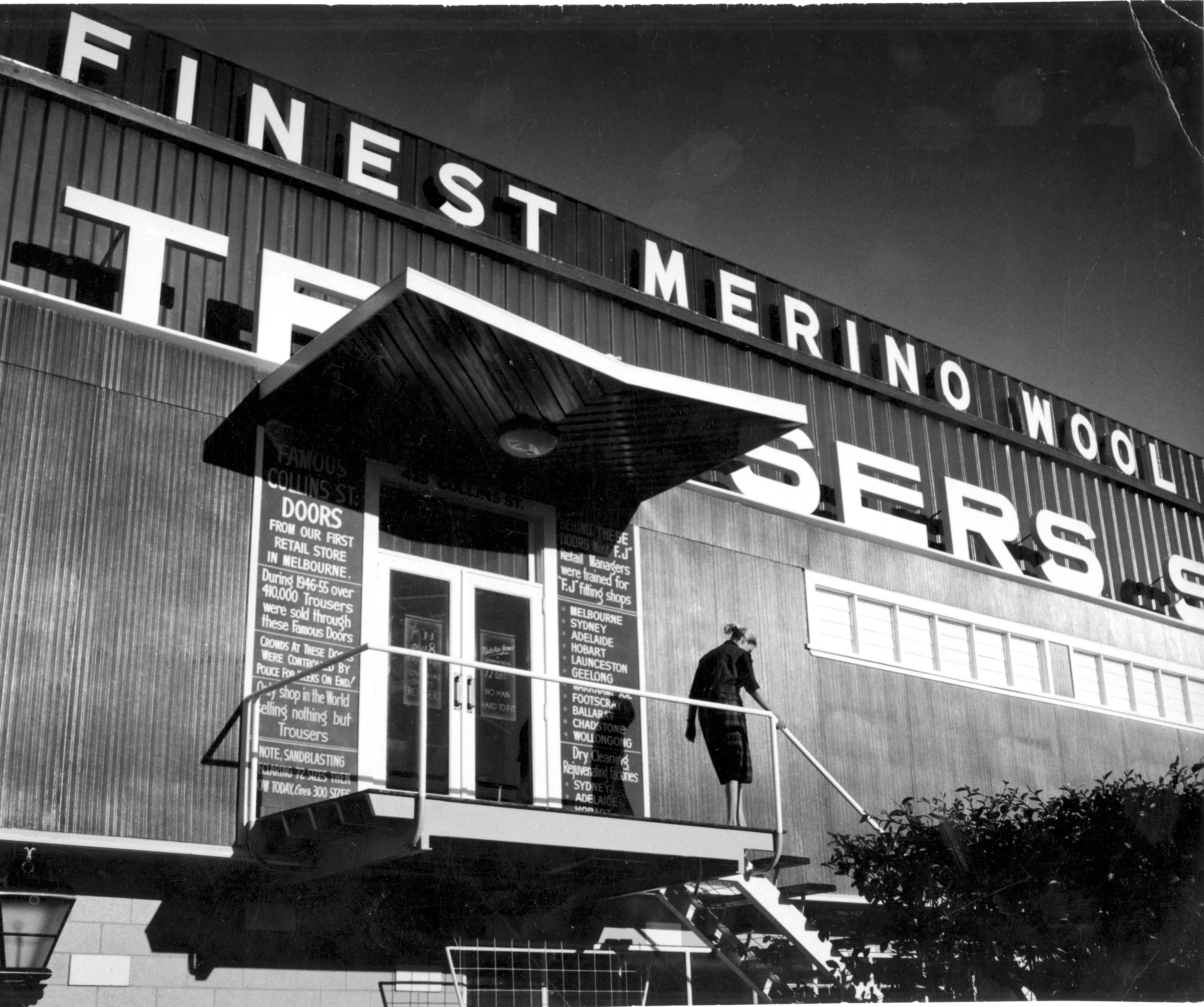 A beautiful screen print on plywood by Ruby Richardson inspired by an evocative photo of a woman leaving the FJ Factory in the 60s via the doors that were originally at the FJ Collins St store.