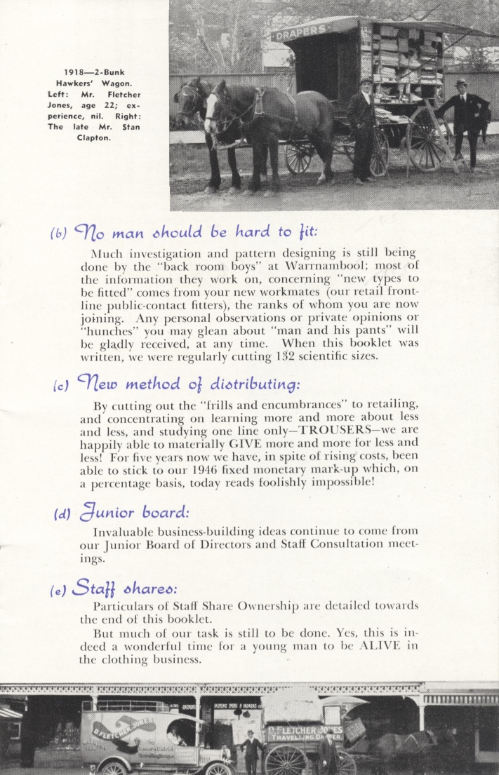 "If you have had previous experince as a clothing salesman, trained in the 'positive salesmanship' you will probably find it difficult to follow the FJ policy of saying "No, no, no", even to the tune of missing sale after sale, rather than allowing customers to purchase anything but a perfect fit, according to accepted FJ standards." From FJ Staff guide booklet.