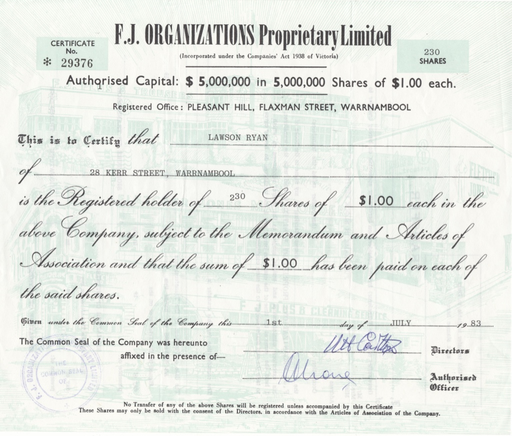 In 1949, FJ called on his solicitor, Neil Symons and told him reorganise the firms shareholding so that staff would own 51% of the stock.  Staff shareholding grew as the firm grew.  By 1972, Fletcher Jones staff owned over 70% of the company.  In the same year, there were 950 staff employed at Pleasant Hill FJ factory in Warrnambool.