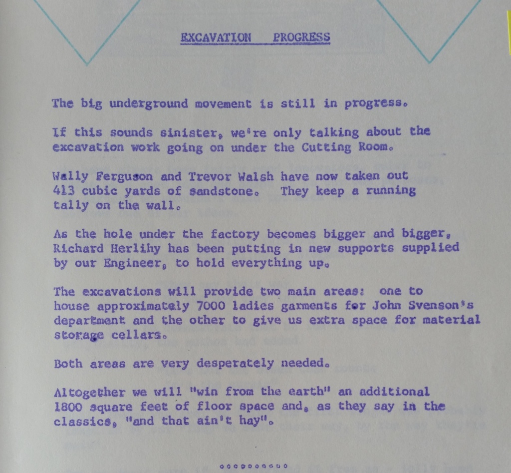 The excavations will hold two main areas: one to house approximately 7,000 ladies garments for John Stevenson's department and the other to give us extra space for material storage cellars.  Both areas are desparately needed.
