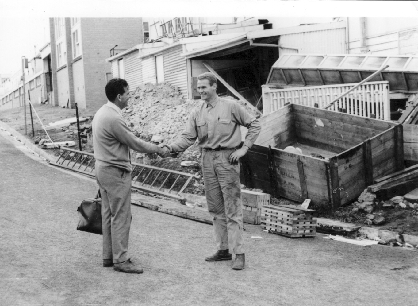 Series 3- Cranes and Workers in honour of Arnold McKay, who took these photos the day the ball went up in 1967. Arnold was a sewing machine mechanic for 25 years at Fletcher Jones and he took these photos as an amateur photographer recording the event.