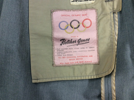 Carefully stitched on to the inside of the skirt are the distinctive/descriptive FJ labels, which provide insight into the unique materials and methods used to make the skirt. The ‘Fabrilastic Comfort Waist’ and ‘Coverdine styled by Fletcher Jones’ were essential to the finished product worn by Olympians such as Betty Cuthbert and Lorraine Crapp at the opening ceremony, which was televised for the first time into Australian homes at the Melbourne Games. In characteristic style, an inscription on the label carrying the Olympic insignia implores the athlete to ‘care for this skirt always’.