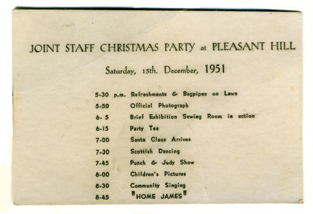 Each year, Fletcher Jones held a staff Christmas party and lots of people have wonderful memories of these parties and the Christmas presents they received. Since 2014, alongside the restoration of the Fletcher Jones Pleasant Hill site, community picnics have been held in the gardens annually in December to echo and celebrate this aspect of Fletcher Jones history.