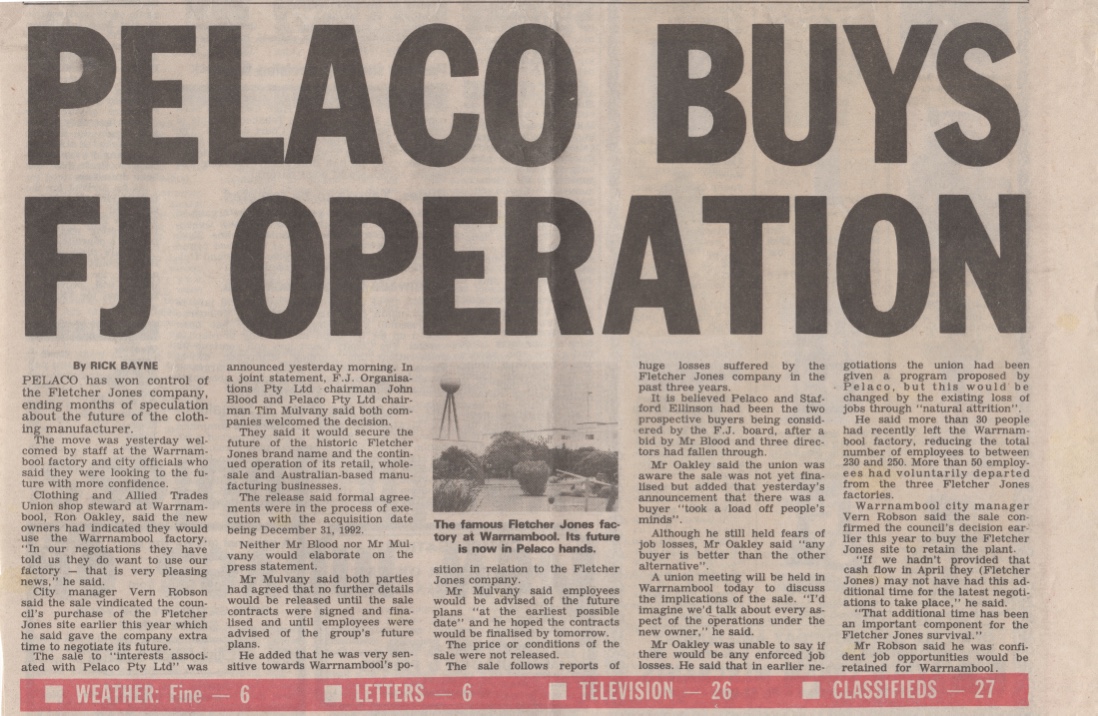 In December, the FJ company was sold to The Australian Apparel Company which was formed by shareholders of Pelaco. The private company was formed to run Fletcher Jones and Australian clothing manufacturer and distributor Pelcaco Pty Ltd. "The Pelaco business and, of course, Fletcher Jones' business, will run independently" Australian Apparel chairman Tim Mulvany said.
