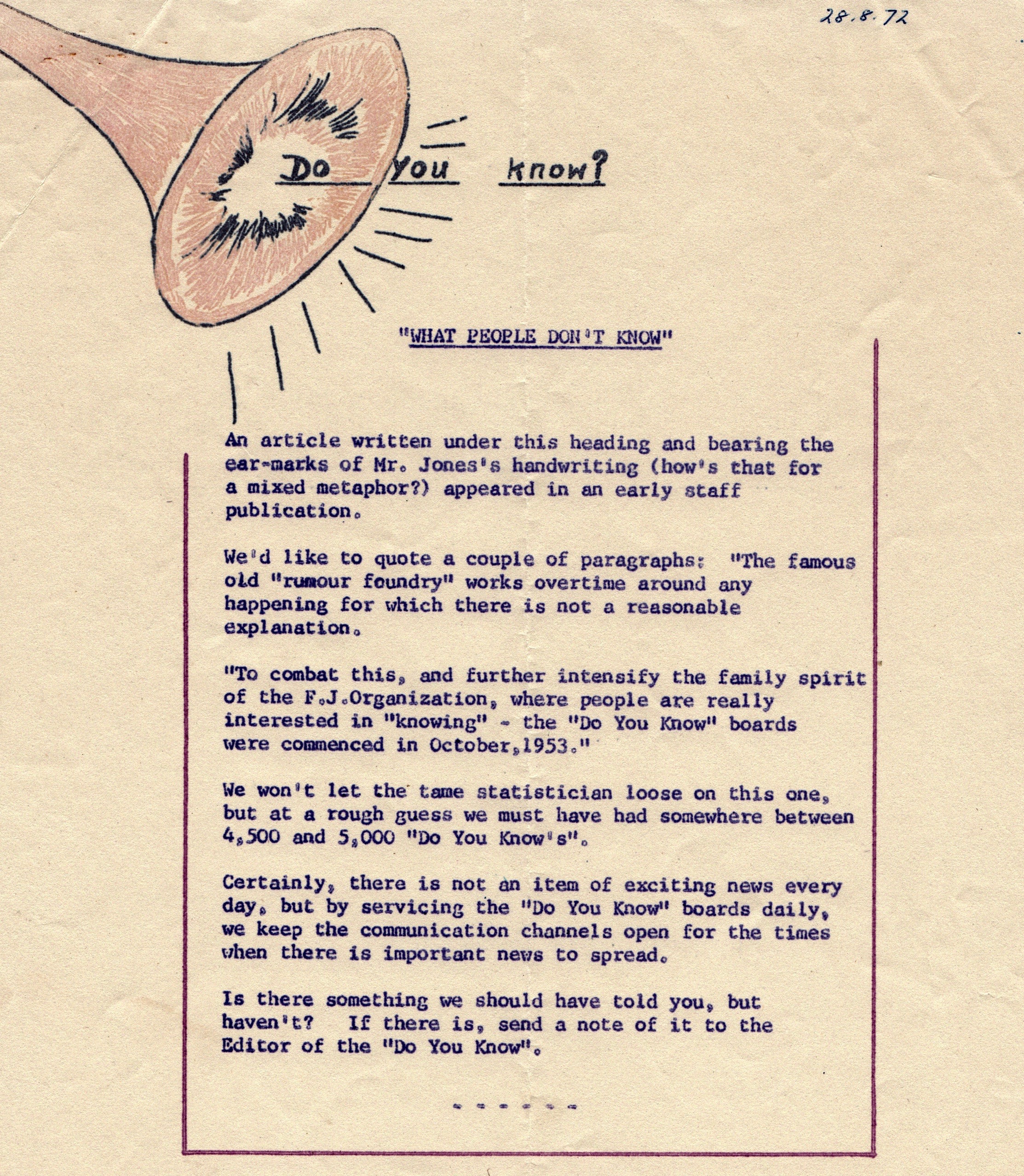The famous old rumour foundry works overtime around any happening for which there is not a reasonable explanation. To combat this and further intensify the family spirit of the F.J. organisation, where people are really interested in 'knowing' - the Do You Know boards were commenced in October 1953. ... Certainly there is not an item of exciting news everyday, but by servicing the Do You Know boards daily, we keep the communication channels open for the times when there is important news to spread. Is there something we should have told, but haven't? If there is, send a note of it to the editor of Do You Know. What People Don't Know - 28.8.72.