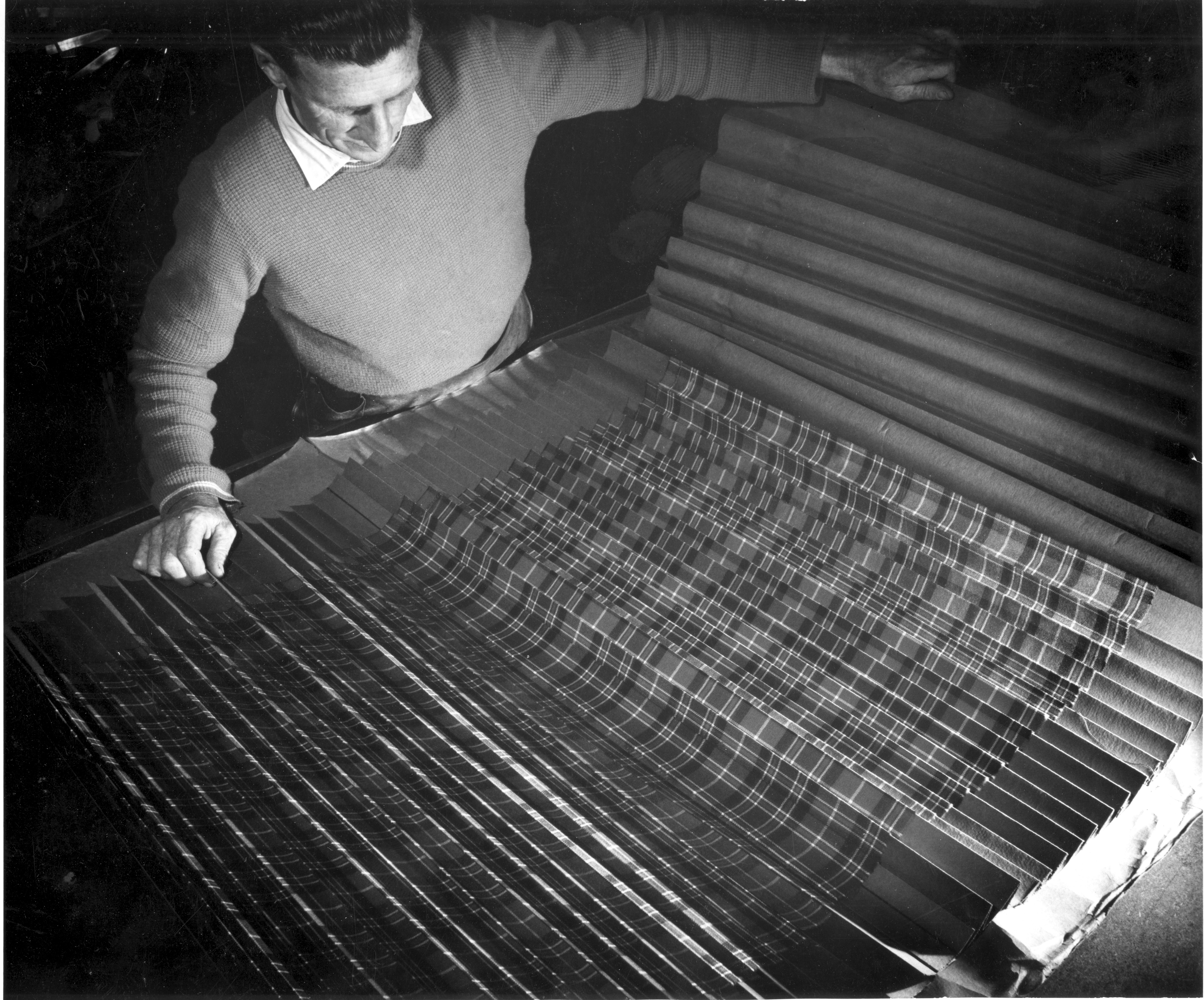 A very important role is played by the humble hypodermic syringe in our trousers cutting room. The si-ro-setting of the front pleat or crease must be spot on. Probably we are the only pants maker in the world who go to the trouble of si-ro-setting through up to the waistband. Early on, to mark the inside of the lay in the exact position on which this crease should form was a slow tricky process. Pleasant Hill then developed a method, which was simple and effective, and world class. First a smooth drill similar to a knitting needle was used to drill through the layers of cloth in such a manner as to part the yarn but not the fabric. A hypodermic syringe, filled with chalk solution, was then inserted into the hole made by this special needle, and the hole filled with chalk solution. When dry, the result is a tiny white dot showing exactly where the presser should end his pleat. After pressing, this white dot disappears entirely and so does the little hole - Hey Presto.