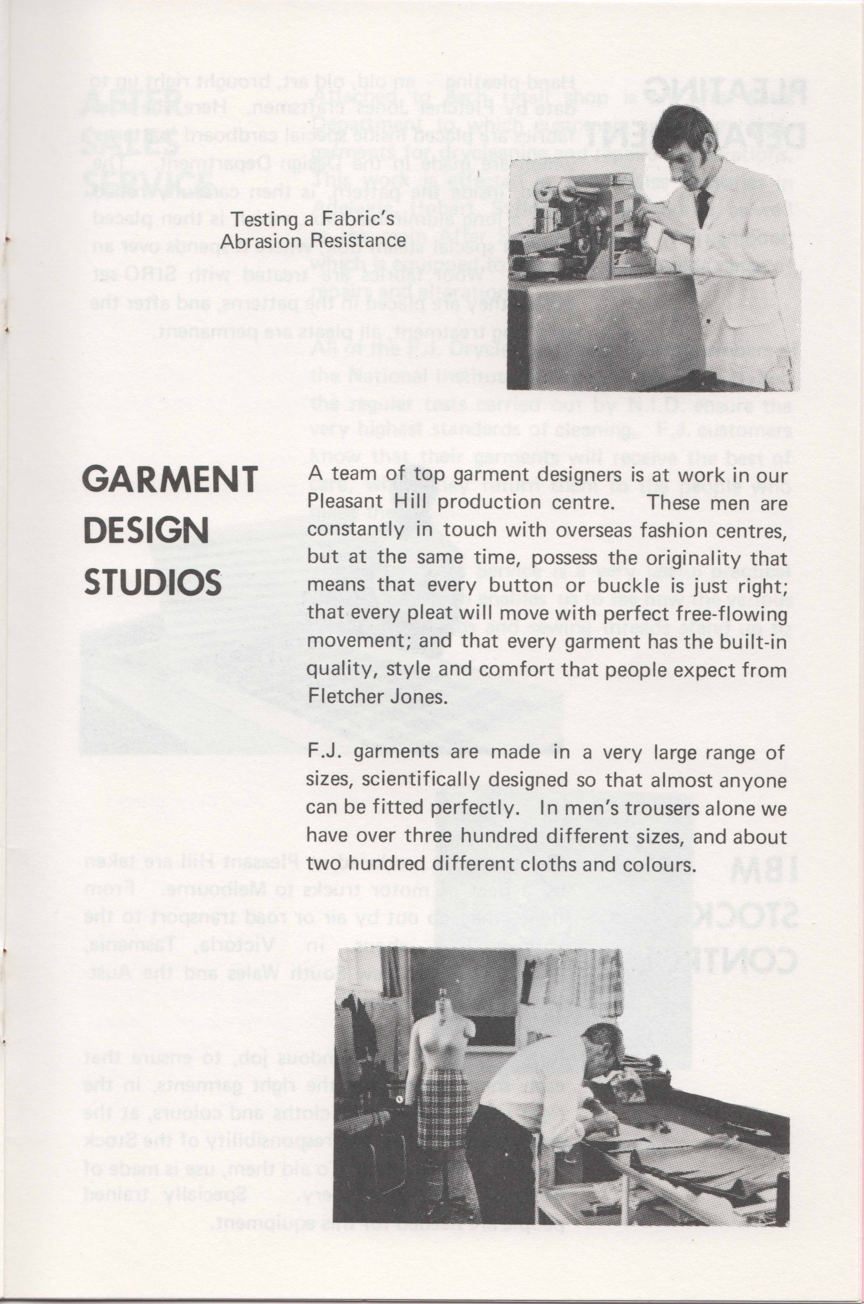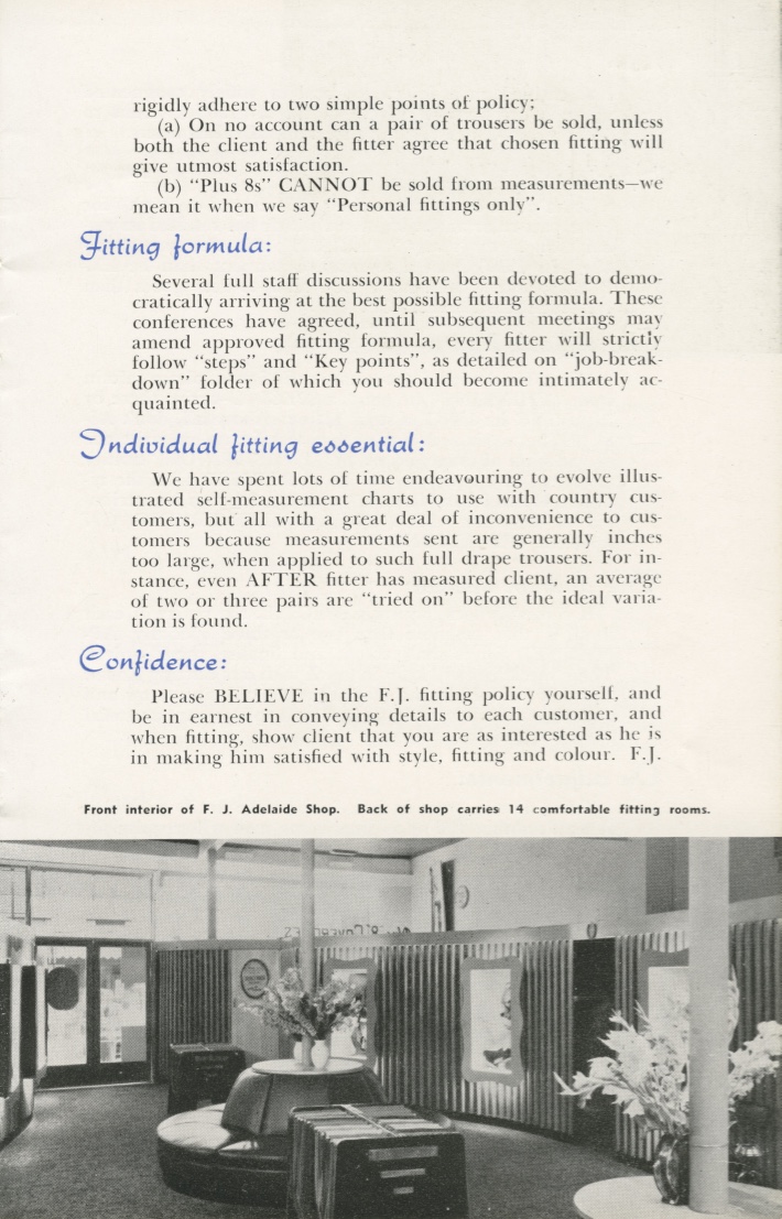 "If you have had previous experince as a clothing salesman, trained in the 'positive salesmanship' you will probably find it difficult to follow the FJ policy of saying "No, no, no", even to the tune of missing sale after sale, rather than allowing customers to purchase anything but a perfect fit, according to accepted FJ standards." From FJ Staff guide booklet.