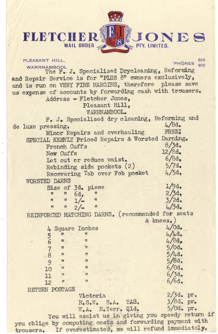 "In the late 1940s FJs was receiving complaints that their garments were shrinking with some dry cleaners and so we decided to set up our own dry-cleaning factory in Warrnambool where we carried out dry cleaning, repairs and alterations on customers garments. At first garments were sent to Warrnambool to be dry cleaned from all stores around Australia. The freight proved quite expensive as they were sent by air to Melbourne and then on our truck to Warrnambool, which would run daily. We then decided to open our own dry cleaning factories in Brunswick, Sydney, Hobart, Adelaide and Brisbane as well as Warrnambool. These factories also carried out new garment alterations for the retail stores.