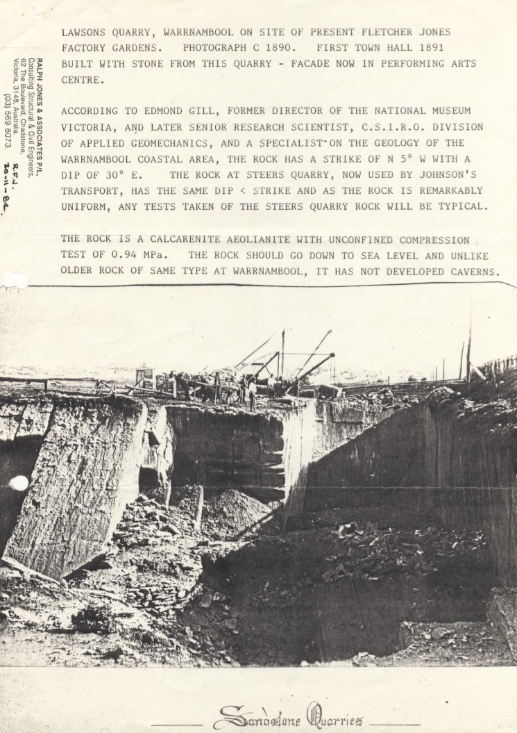 The quarry was Lawson's Quarry. The first Town Hall in Warrnambool was built in 1891 with stone from this quarry and the facade still exists at the Lighthouse Theatre in Warrnambool.