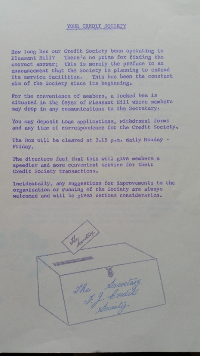 "The Fletcher Jones and Staff Employees'Co-operative Credit Society Limited is owned and operated by our staff for their own benefit.  You can use the Credit Society as a savings bank.  If you are over 18, you may be able to obtain a loan.  If you deposit money with the Society, you'll earn better than savings bank interest.  If you borrow, you'll pay much less interest than is charged by finance companies.  Your section leader will tell you how to get more information." From the FJ Staff information booklet.  (Loaned to FJ Stories Project by Lawson Ryan).