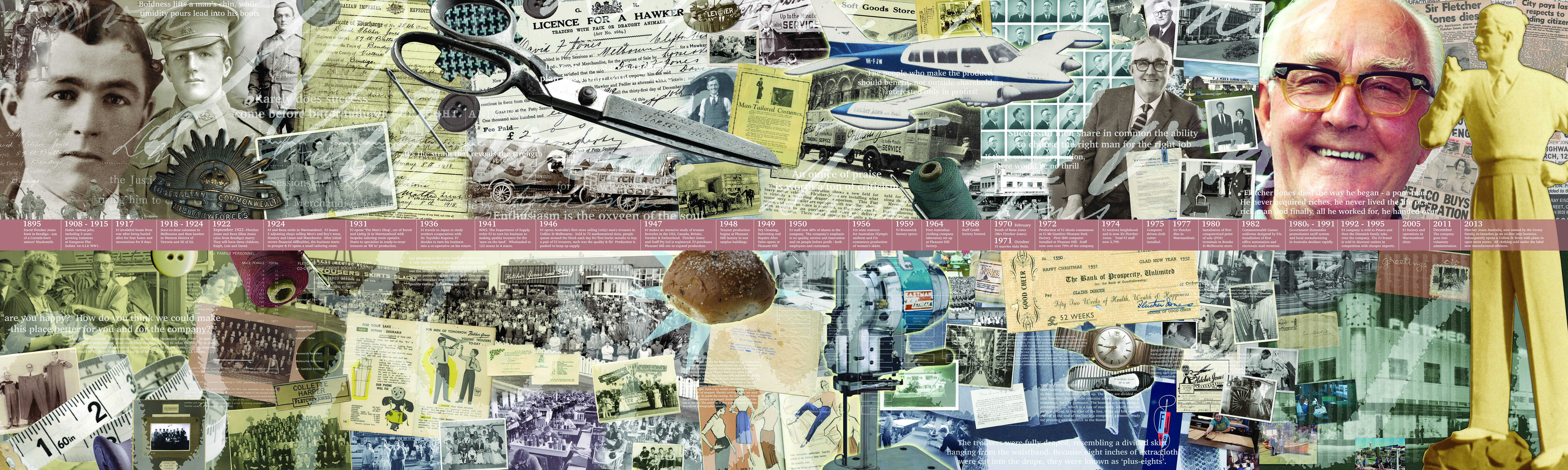 This 5mx1.5m panel documents the life of Sir Fletcher Jones and the business he built on his return from service in WW1. We see images of FJ as a young soldier and as a travelling hawker through to his knighthood in 1974, having built a successful clothing manufacturing business employing almost 3,000 people.