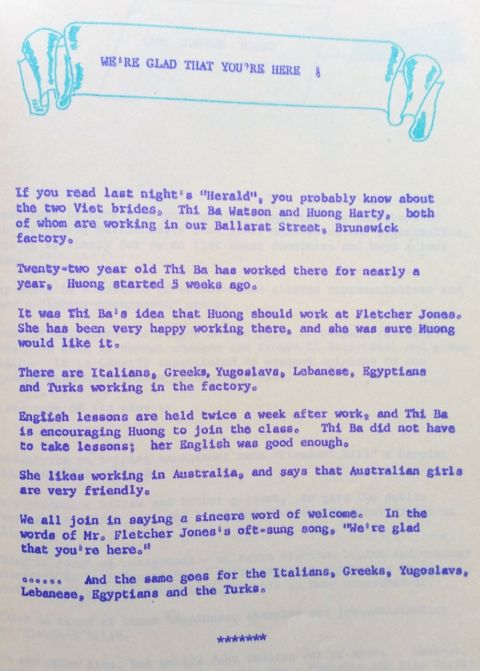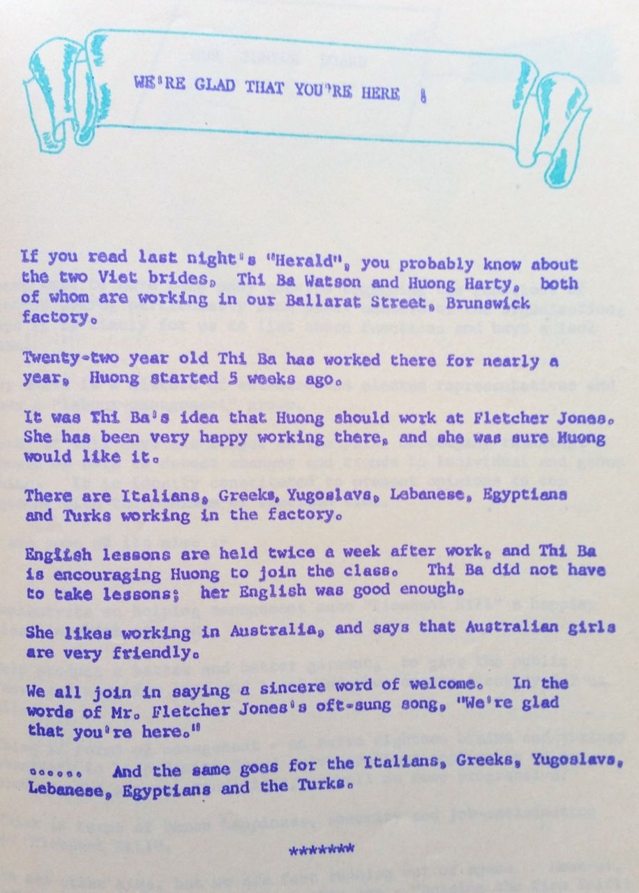 We’re Glad that You’re Here  - this is a 'Do You Know' from 1971,  written by Eric Tonkin.  It describes very well how Fletcher Jones welcomed people of all cultures in their factories and stores.